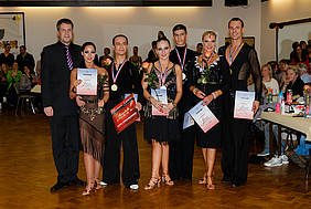 Sechs TSH – Paare gingen unter den 20 Paaren in der Hauptgruppe A Latein an den Start, alle gut vorbereitet und voll motiviert. Leider kam für Jöns und Ingar Baumm (Norderstedt) sowie Max Richter und Liana Sophie Michel (Börnsen) nach der Vorrunde das Aus. Beide Paare zeigten eine ansprechende Leistung die auch von einigen – leider nicht allen – Wertungsrichtern honoriert wurde. So fanden sich noch vier Paare des TSH im Semifinale, wobei sich letztendlich Mattes Michelsen und Lynn Rasmussen (1. Latin Team Kiel) auf dem 9. Platz wiederfanden. Mattes und Lynn haben sich in den letzten Wochen enorm verbessert und arbeiten sich immer weiter nach vorne. Den undankbaren Anschlussplatz zum Finale erreichten Randolf Baumgartner und Julia Schreiter vom 1. Latin Team Kiel. Sie hätten sicherlich das Finale verdient gehabt mit einer tollen Leistung. Immerhin durften sie die Bronzemedaille des TSH in Empfang nehmen.